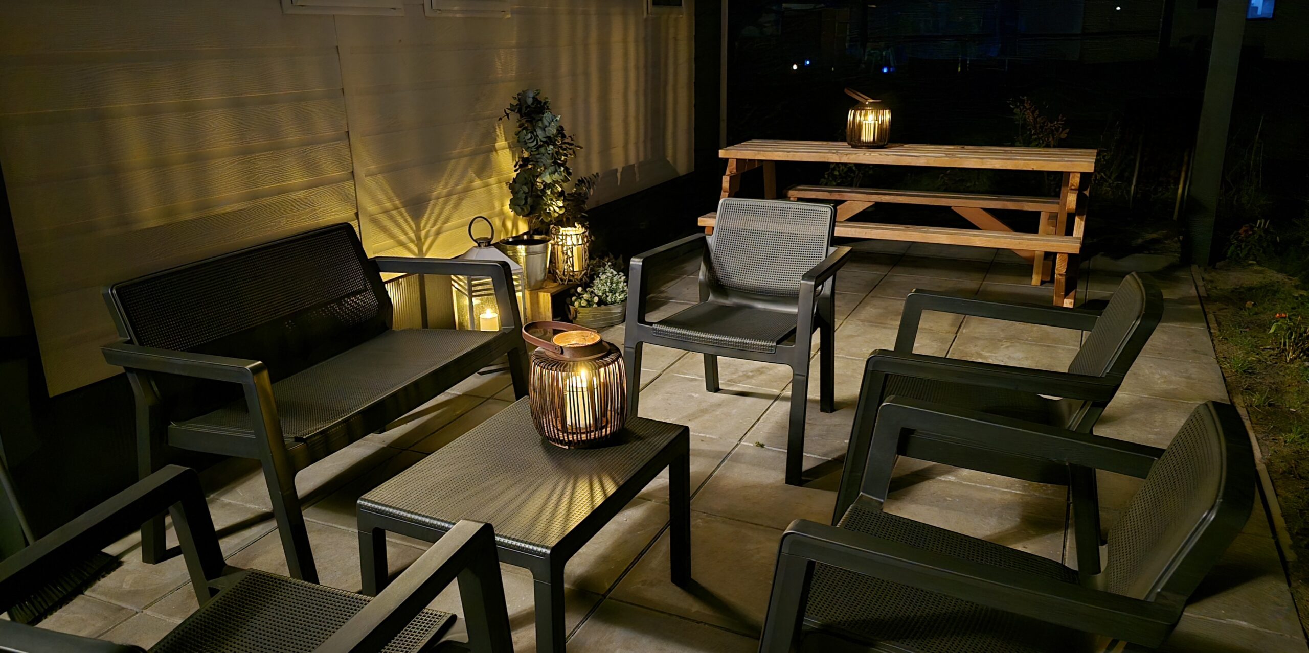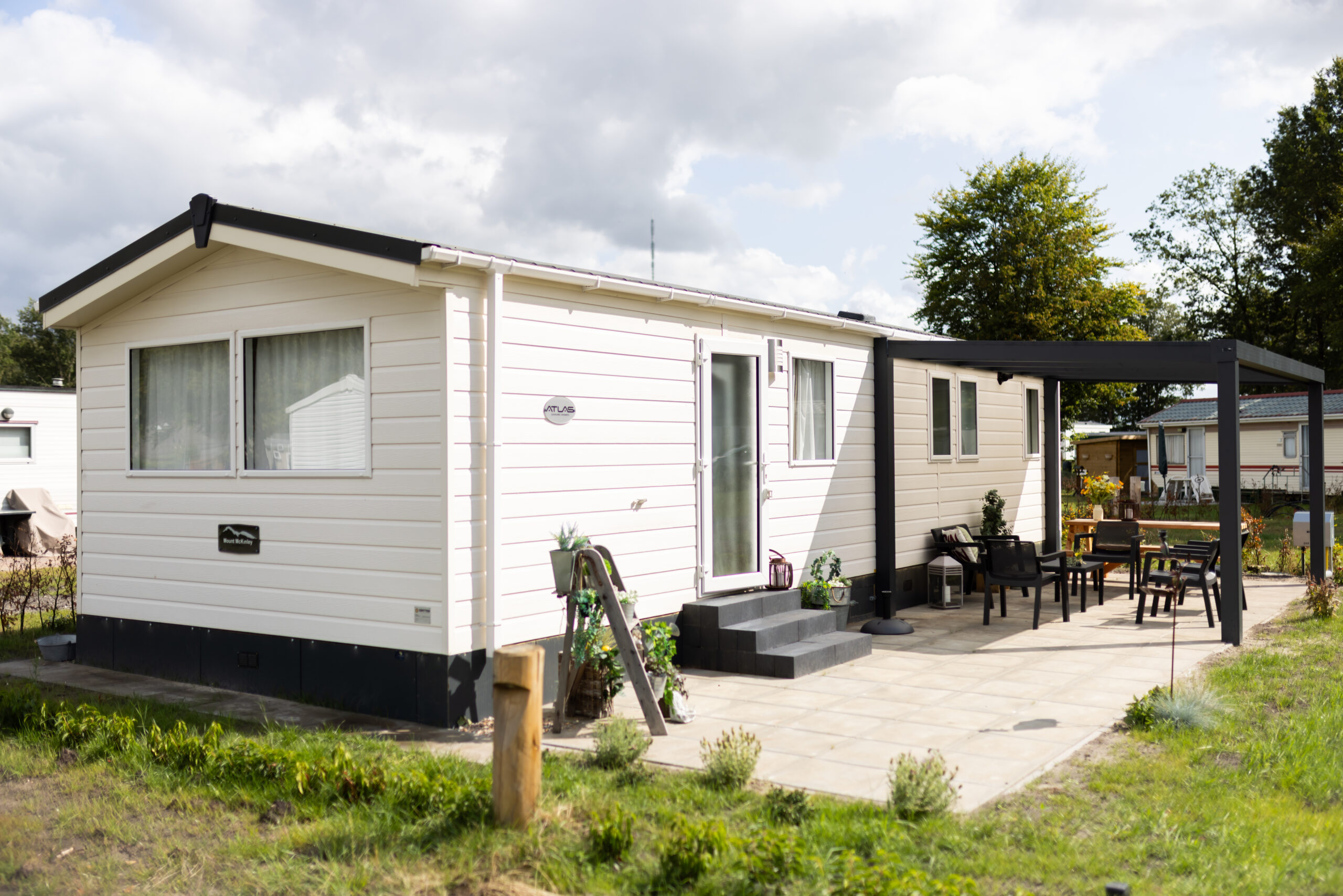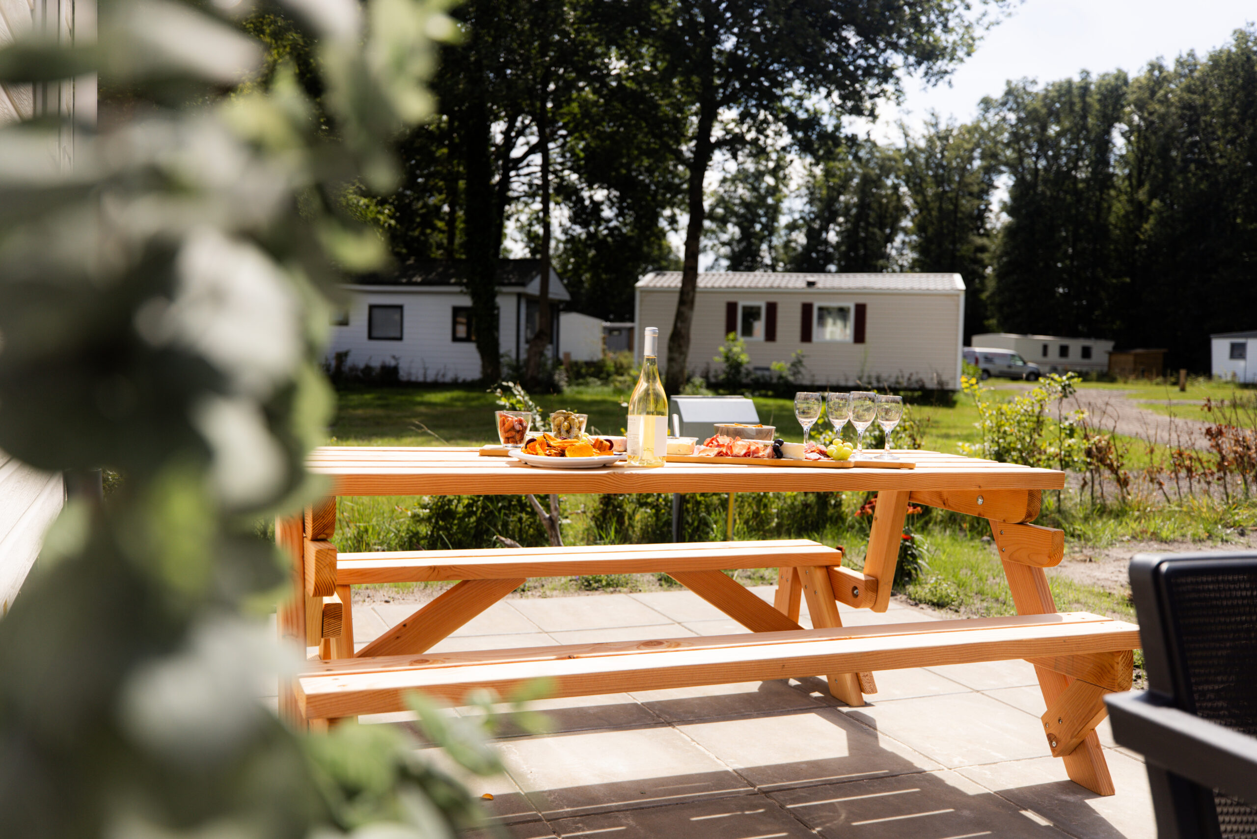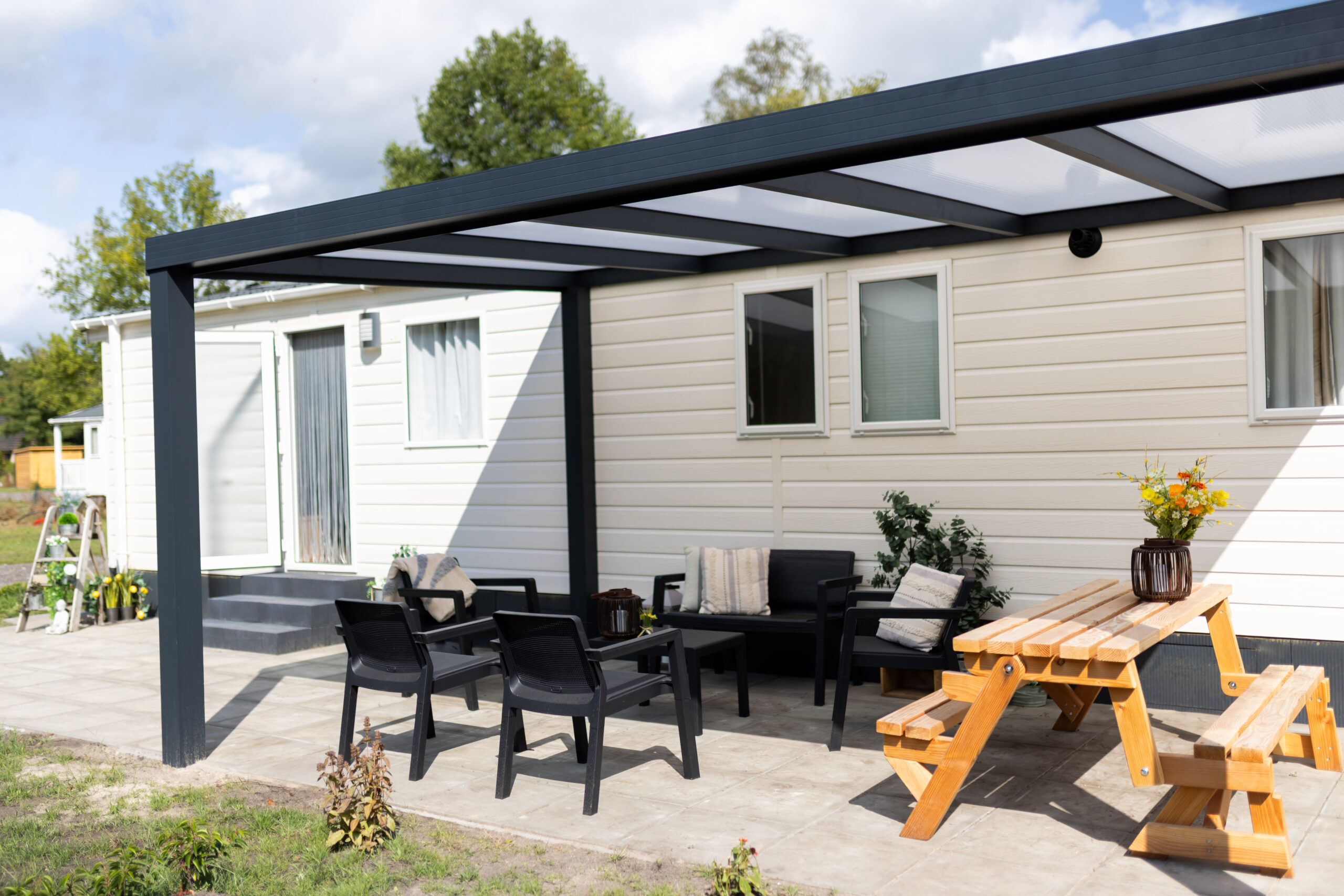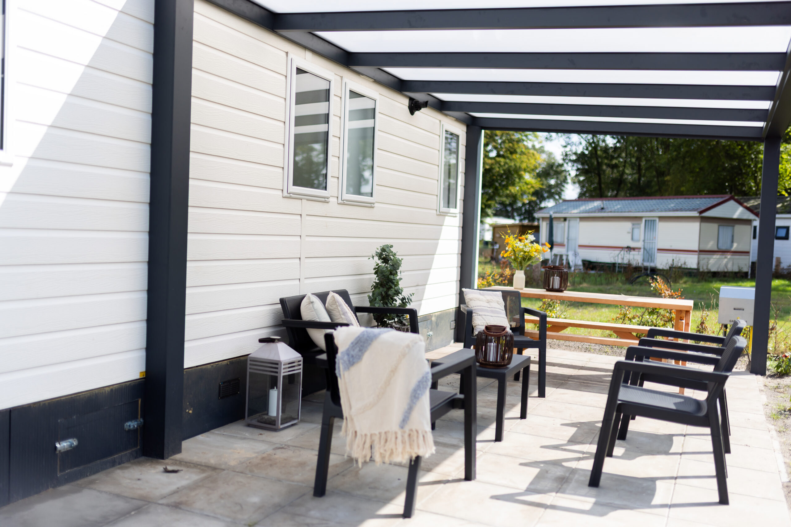 Zelfs op koelere dagen zit je er dankzij de centrale verwarming heerlijk warm bij. Buiten wacht een ruim terras met een comfortabele tuinset en picnicktafel, ideaal om ’s ochtends van een ontbijt in de zon te genieten of ’s avonds gezellig te borrelen. Een deel heeft een fijne overkapping, zodat je ook als het een beetje mocht regenen toch lekker buiten kunt blijven.